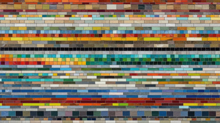 A close-up view reveals intricate, wavy patterns of colorful tiles arranged in a mosaic, showcasing a blend of vibrant hues and textures, creating a dynamic visual flow.