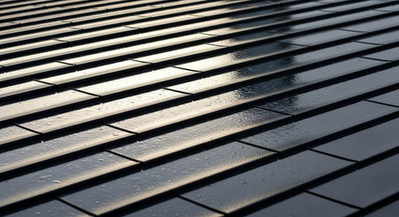 a close up shows a wet dark gray roof with tiles reflecting light on a cloudy day after rainfall outside