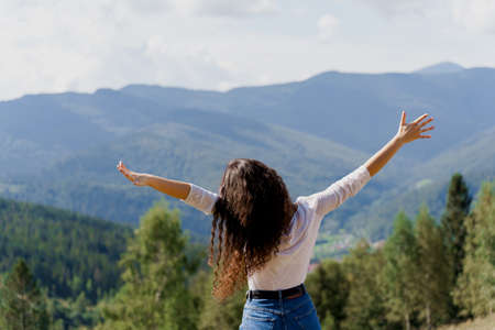 Tourism traveling in Ukraine. Girl girl raised her hands up and enjoys the mountain hills view. Feeling freedom in Karpathian mountains.