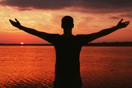 Unspecified man with hands up watching sunset