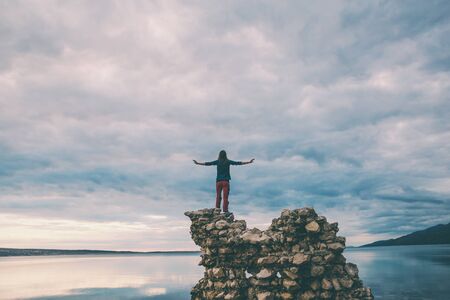 Freedom traveler woman standing with raised arms and enjoying ,with instagram filter