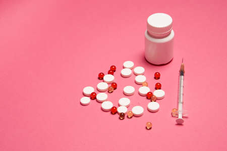 jar, pills, syringe, health, pink background.