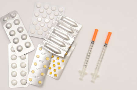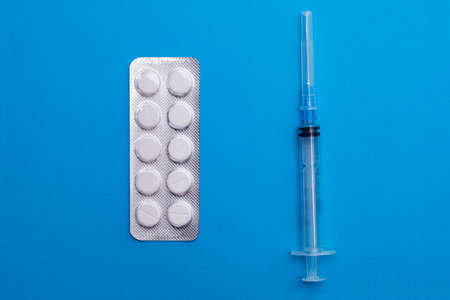 Medical syringe and medical tablet blister isolated on blue background close-up. Minimalistic. The view from the top. Concepts of medicine. Antibiotics, painkillers, vitamins. Concept of different treatment methods