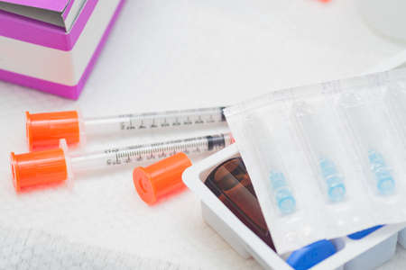 Medical equipments, injections, insulin, serum and vaccine bottles, on brown leather cover taplet of doctor. Concept for looking after the patients in clinic. (Selective focus)