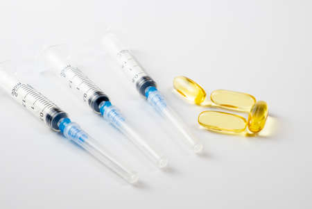 medical syringe isolated on white background with different pills