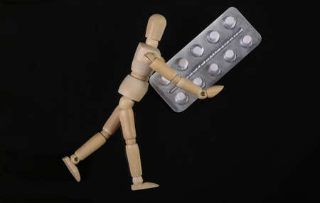 Wooden puppet mannequin holding blister of pills isolated on black background