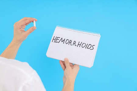 Woman holds text hemorrhoids and suppository on blue background