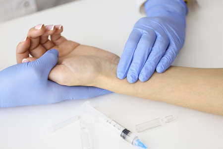 Doctor measuring pulse on patient forearm near empty syringe and medication closeup