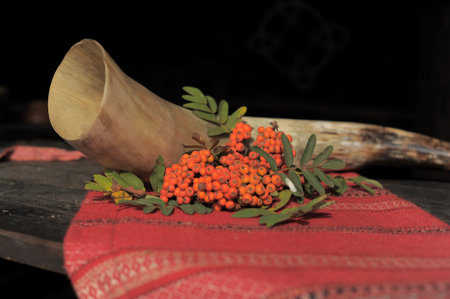 animal horn, tablecloth and rowan berries, still life