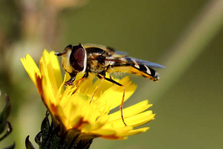 a kind of insects named syrphidae, it is collecting nectar on a dandelion flowers , nature photographer pictures.