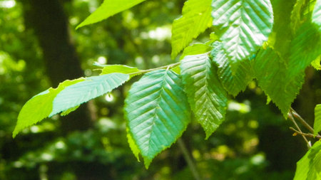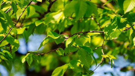 Hornbeam leaf in the sun. Hornbeam tree branch with fresh green leaves. Beautiful green natural background. spring leaves.