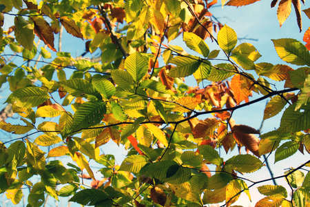 Autumn leaves on tree in sun beams