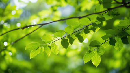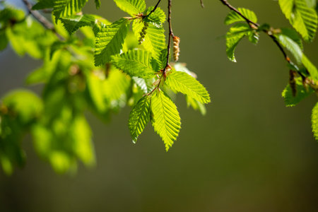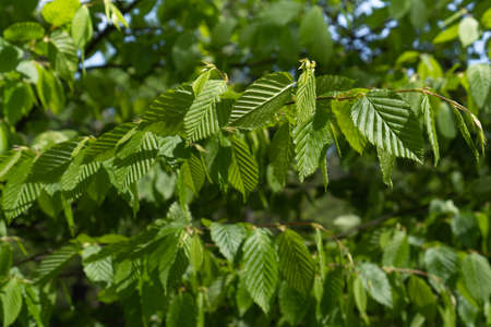 Hornbeam tree branch with fresh green leaves. Beautiful green natural background.