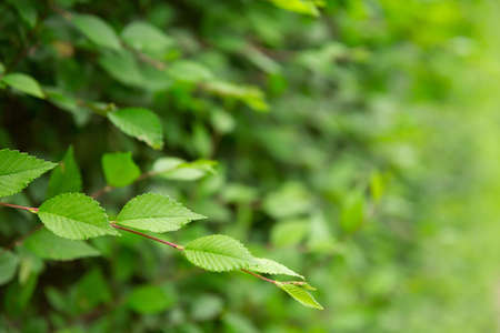 Close-up image of bright green leaves on a tree brunch in spring
