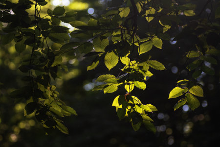 Green leaves in the forest, illuminated by the rays of the sun
