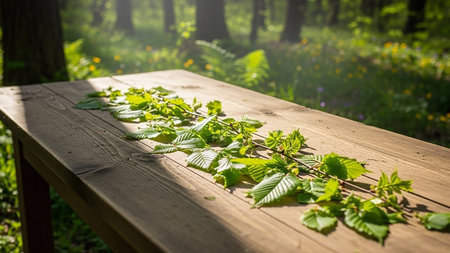 Wooden table with green leaves and flowers in the forest in sunlight