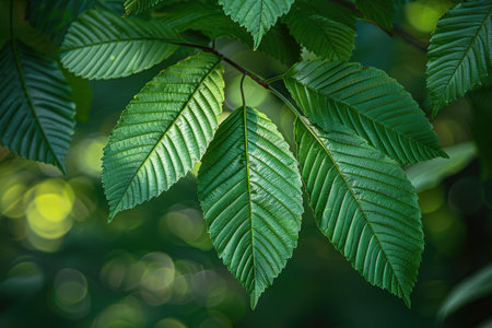Close-up capturing sunlit green beech leaves hanging from branches, exhibiting their intricate vein patterns and serrated edges. A blurred bokeh background enhances the depth and focus.