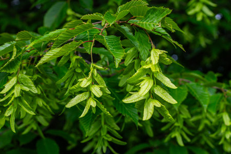 Bright green leaves with distinctive toothed edges adorn a European hornbeam branch showing its unique winged fruits in a thriving forest setting during springtime.