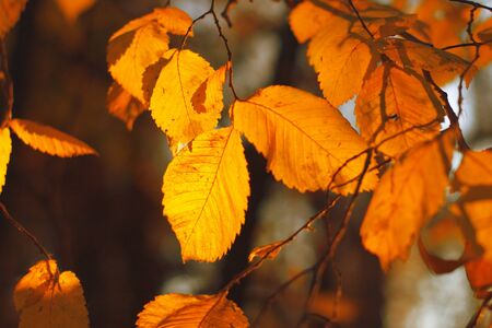 Close up of bright vibrant yellow leaves on a tree branches in autumn park. Detail of fall forest foliage.