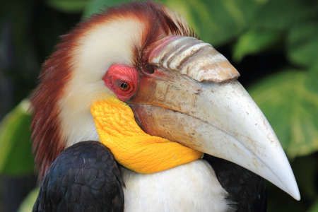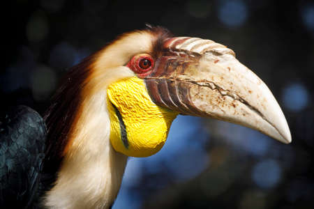 Portait of a wreathed hornbill bird with huge beak and beautiful blue throat pouch