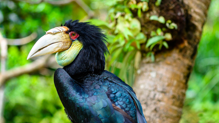 Silver-cheeked horn bill sitting on a branch. colorful plumage. large beak of australian bird. Animal photo