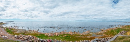 Beautiful summer landscape with sea view on the sandy shore with green grass with cloudy sky Hiiumaa, Estonia