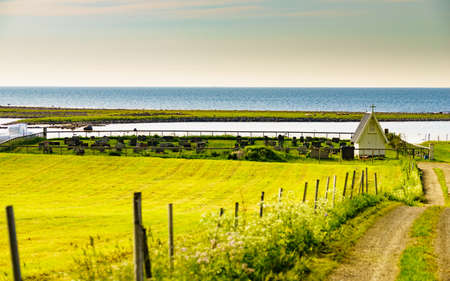 Country road to cemetery burial site with chapel on seaside, Andoya island, Norway.