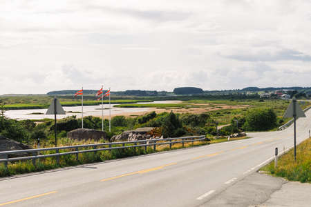 National tourist county route road 44 Jaeren, sothern Norway. Coastal landscape with norwegian flag waving on wind