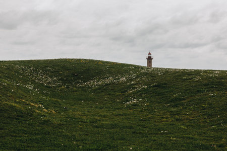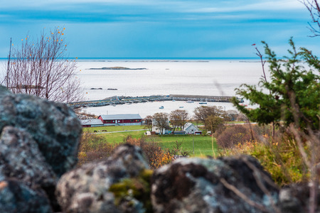 A view of island coastline with Alnes lighthouse in the background. Godøy, Norway