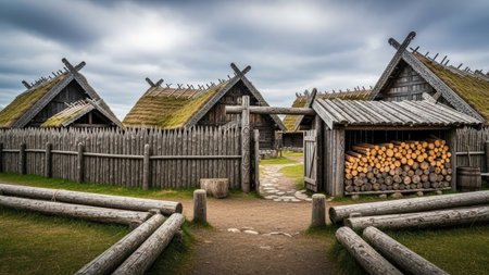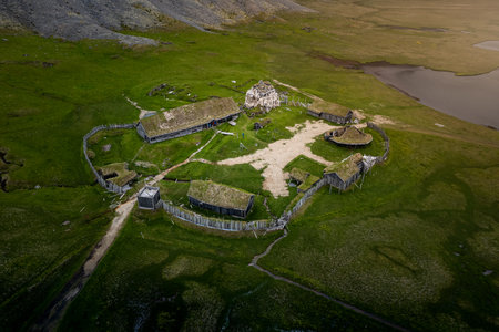 A scenic view of a viking village in Iceland surrounded by green meadows