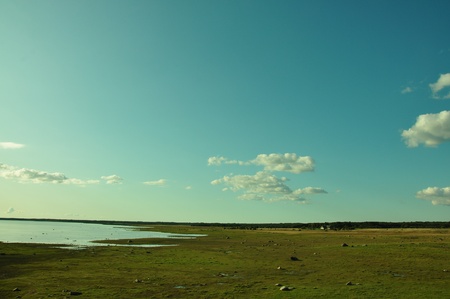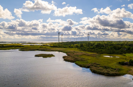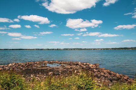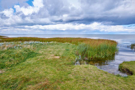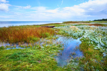 Landscape of marsh lake with reeds against a cloudy horizon. Green field of wild grass by the seaside with a blue sky in Denmark. A peaceful nature scene of calm sea or river near vibrant wilderness