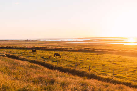 Sunset with wild horses in a meadow in Iceland and a river and sea in the background