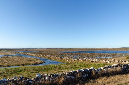 Flooded landscape with traditional dry stone walls in Southern Oland in Sweden
