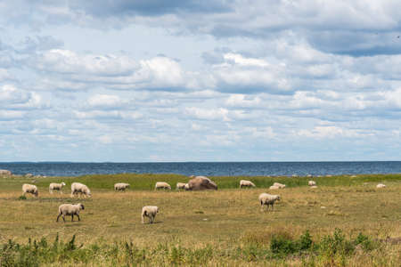Grazing sheep at a coastal landscape at the Swedish island oland