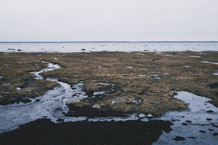 The barren, flat landscape of Jurmo Island in Finland stretches under an open sky, dotted with low-growing plants. This unique Nordic scenery reflects resilience, isolation, and fragile island ecology