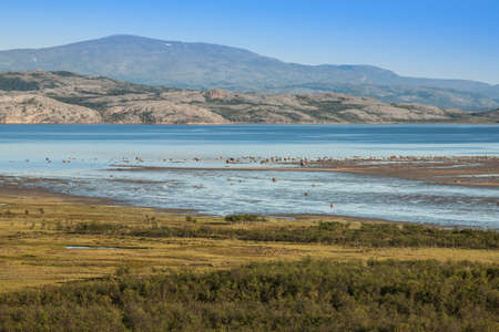 Reindeer Grazing Near Coastal Shoreline in Iceland with Serene Background