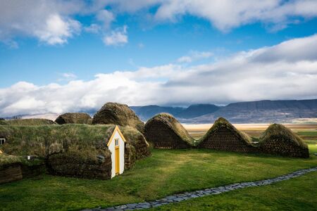 Antique traditional icelandic turf viking houses with cloudy blue sky