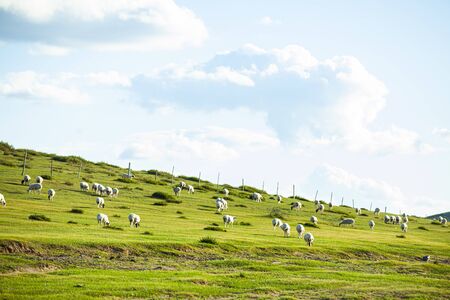 Sheep flock is on the grassland, under the blue sky and white clouds