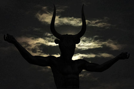 Dark scene minotaur silhouette over night cloudy sky background