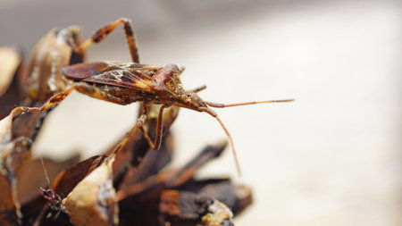 Western conifer seed bug is resting on a pine cone. Detailed Insect Macro Photography of Leptoglossus occidentalis or Brown True Bug