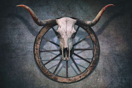 Long horned bull skull and old west wagon wheel hanged on a scratched wall