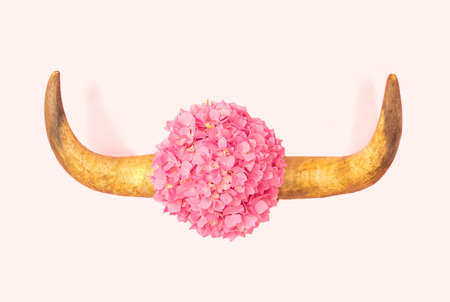 A bull horn with bright pink hortensia in between. Minimal pink background.