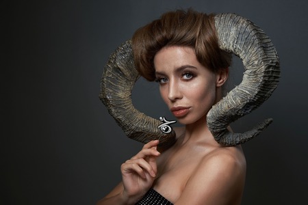 Evil woman with makeup zodiac signs of Capricorn or Aries or Taurus. Girl with horns on head evil