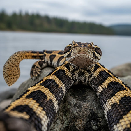 A large snake is coiled on a rock near a body of water
