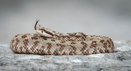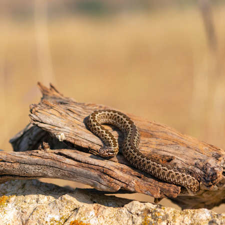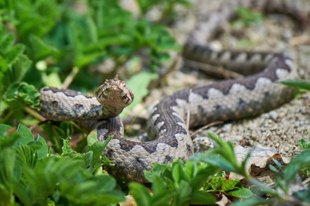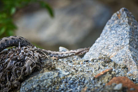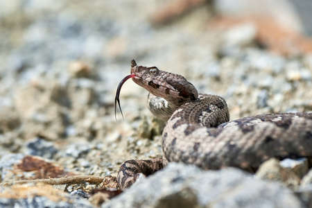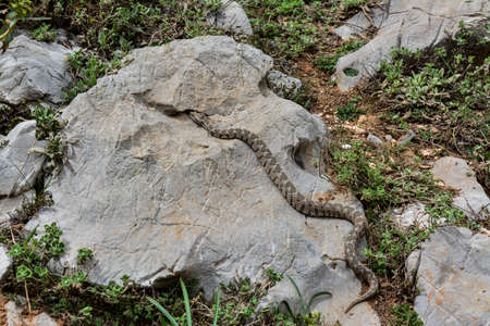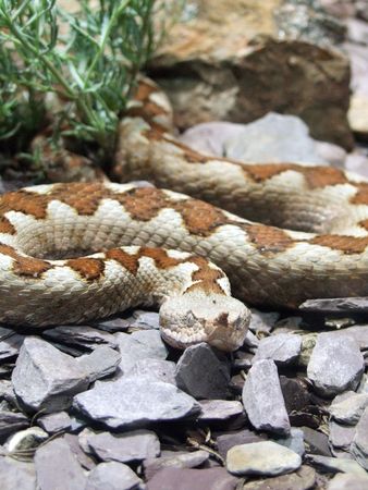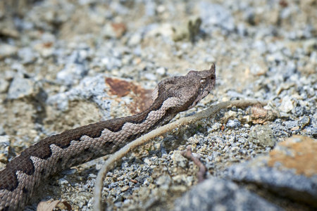 juvenile sand viper resting on a rock; these dangerous european snakes are basking on sunny spots in rocky areas ( Vipera ammodytes )