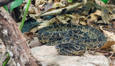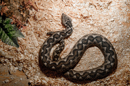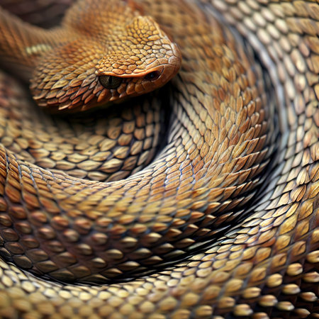Captivating Dark Viper Gazes Intently, Showcasing Its Intricate Skin Patterns in Enigmatic Lighting