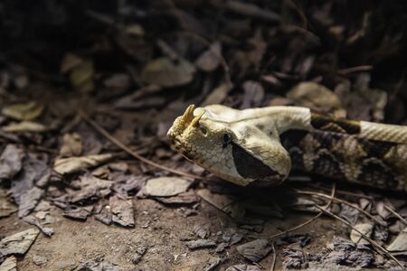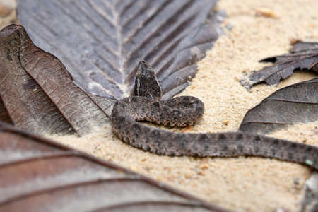 Porthidium nasutum, Rainforest Hognosed Pitviper, brown danger poison snake in the forest vegetation. Forest reptile in habitat, on the ground in leaves, Costa Rica. Widllife in Central America.