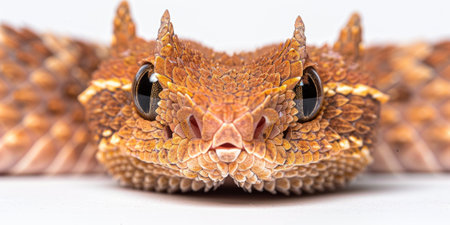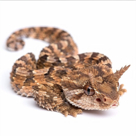 Horned Viper lies motionless with its intricate patterns visible against a soft white background highlighting its distinctive horns and natural beauty.