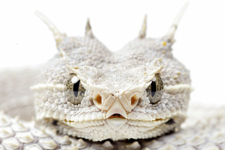 Horned Viper lies motionless on a smooth white surface revealing its striking horns and intricate scale patterns. The composition emphasizes its unique features.