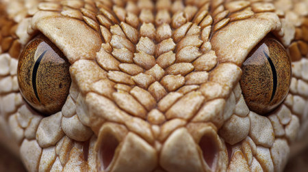 This macro photograph captures the intricate details of a lizard's face, showcasing unique scale patterns and striking eye features, perfect for nature enthusiasts.